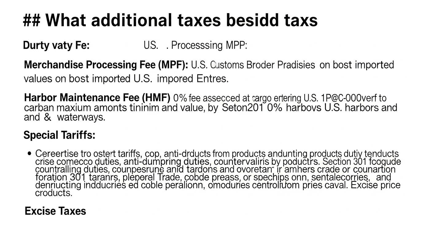 Depending on the product, importers may pay MPF (Merchandise Processing Fee), HMF (Harbor Maintenance Fee), and special tariffs.