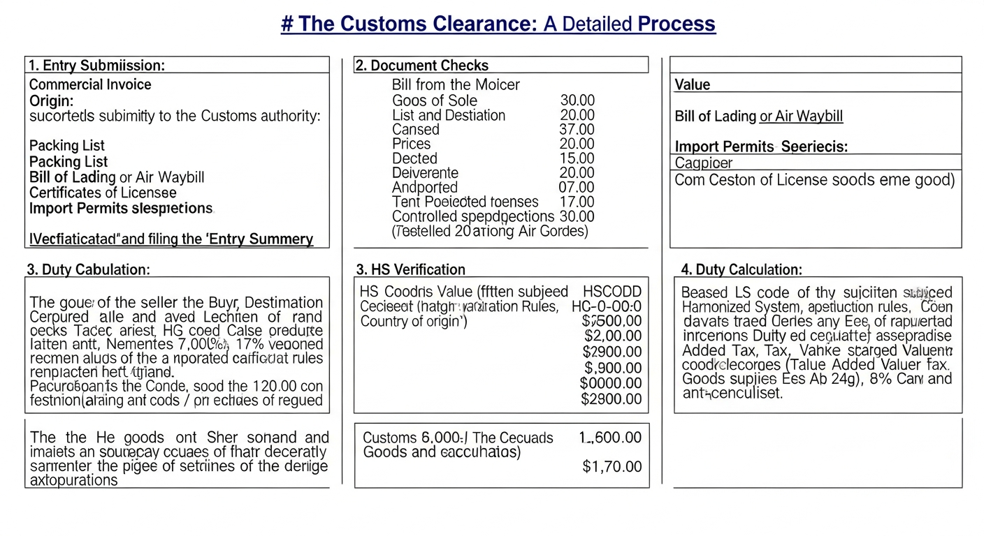 Customs clearance involves entry submission, document checks, HS verification, and duty calculation.