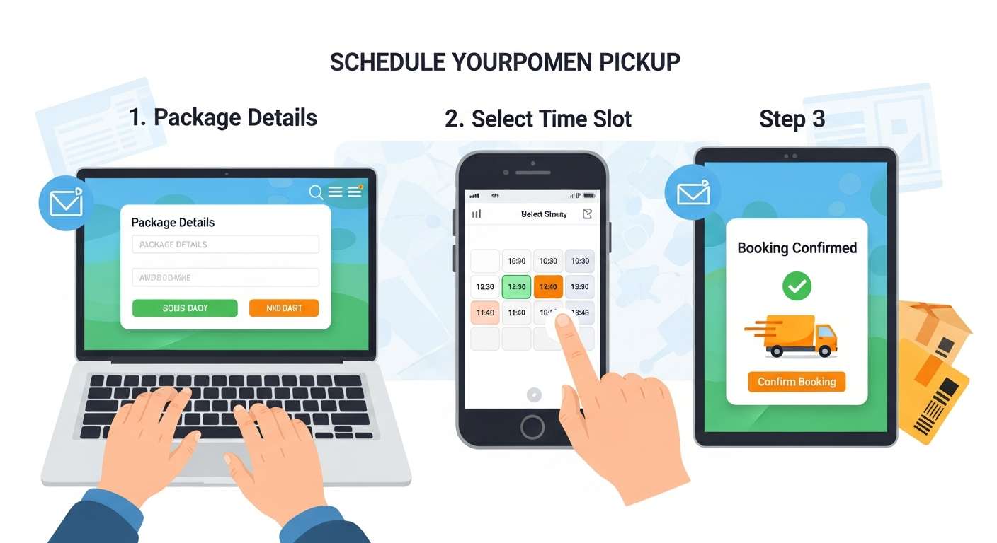 Pickup is scheduled by submitting package details, selecting a time slot, and confirming the booking.
