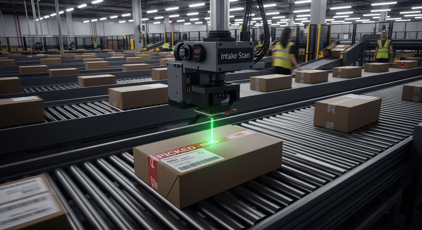 After pickup, the parcel receives an intake scan and begins its transport journey.