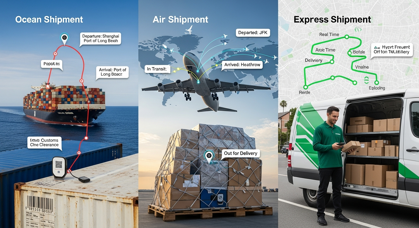 Ocean updates occur at major milestones, so long gaps between vessel departures and arrivals are normal. Air updates are more frequent but depend on airport processing. Express is real-time and provides the most detailed tracking.