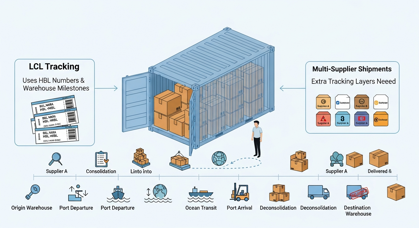 LCL tracking relies on HBL numbers and warehouse milestones rather than container numbers.