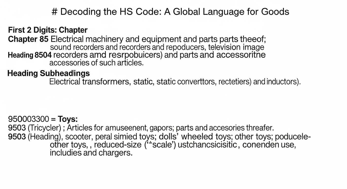 HS codes follow a 6-digit global structure: chapter (2 digits), heading (4 digits), and subheading (6 digits).