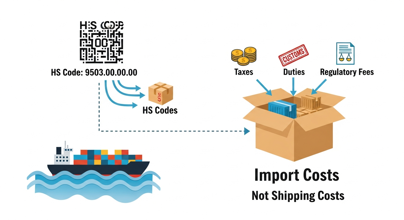 HS codes determine the taxes, duties, and regulatory fees applied during import.