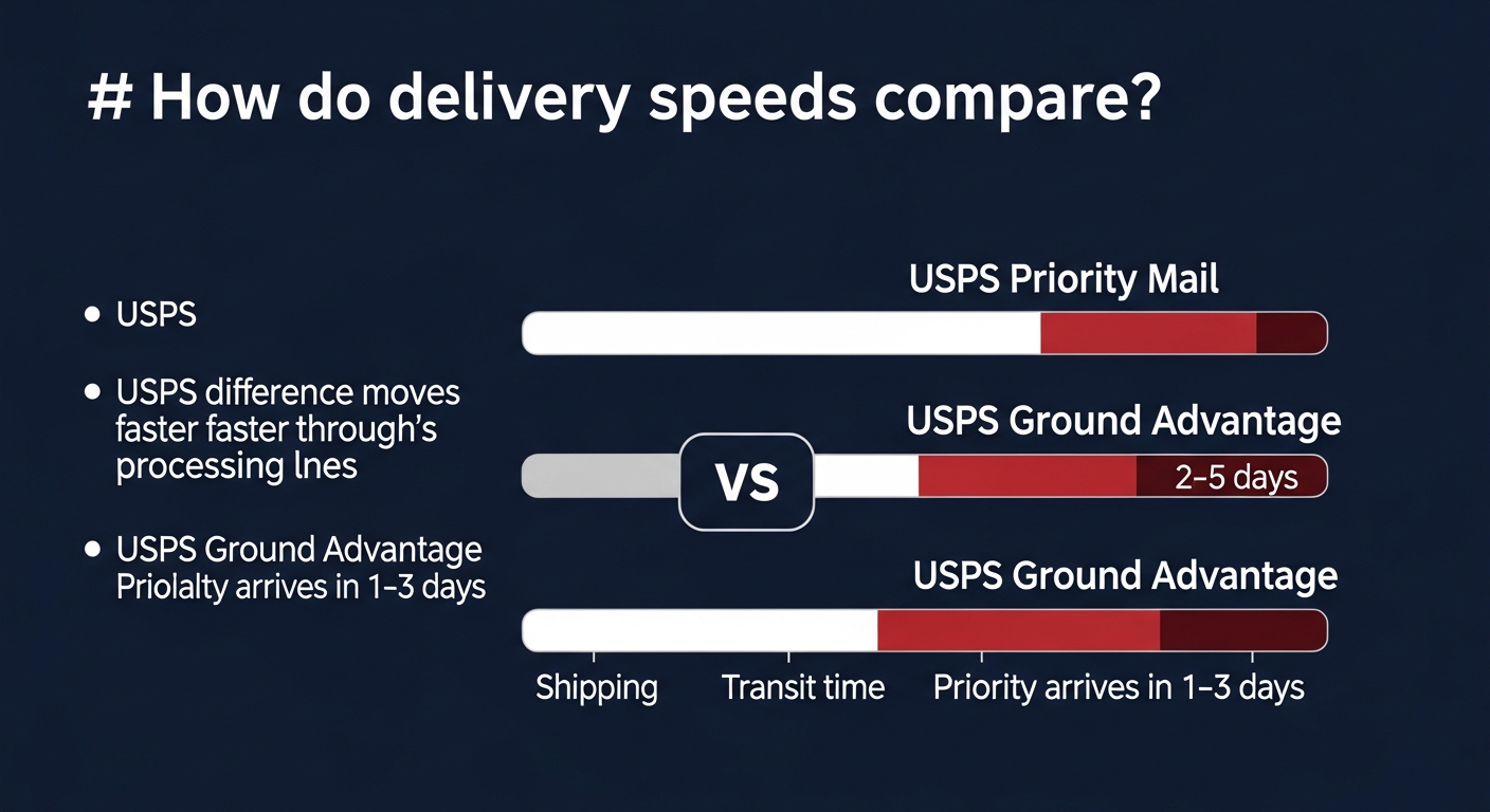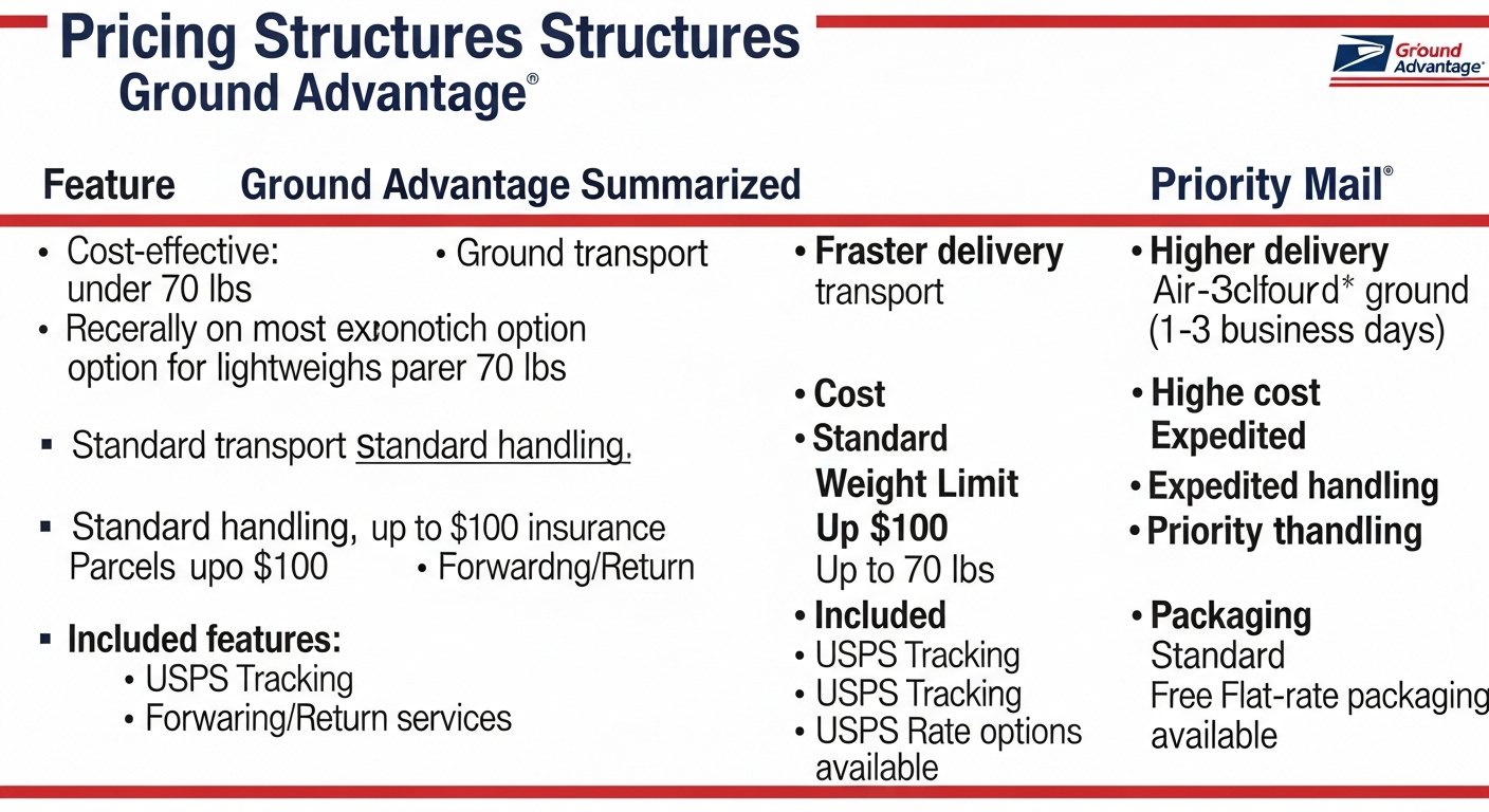USPS Ground Advantage and Priority Mail differ in speed, price, handling priority, and ideal shipment types. Ground Advantage offers economical ground delivery, while Priority Mail provides faster 1–3-day service with improved routing priority.