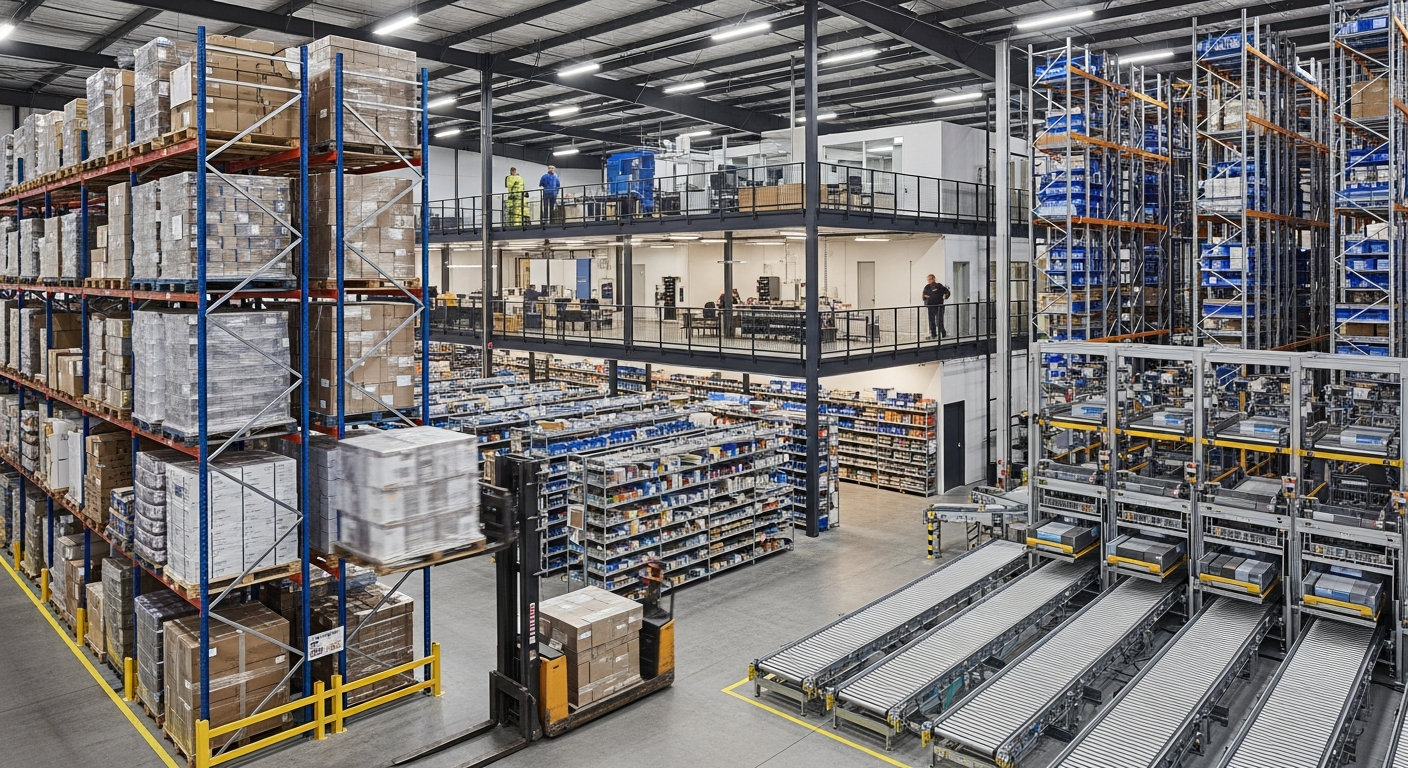 Storage uses pallet racks, carton flow shelves, mezzanines, or automated retrieval systems.