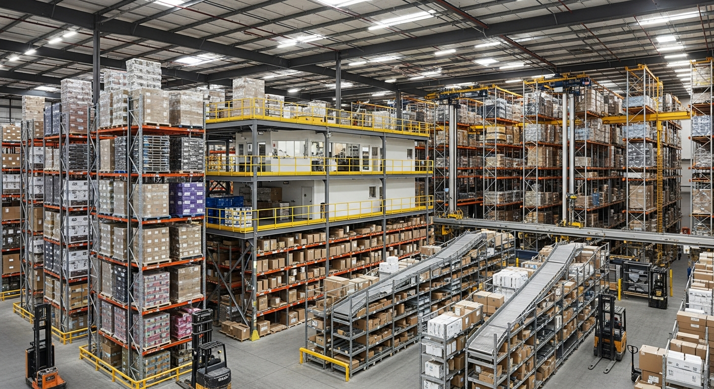 Storage uses pallet racking, carton flow systems, mezzanines, or automated retrieval depending on SKU profiles.